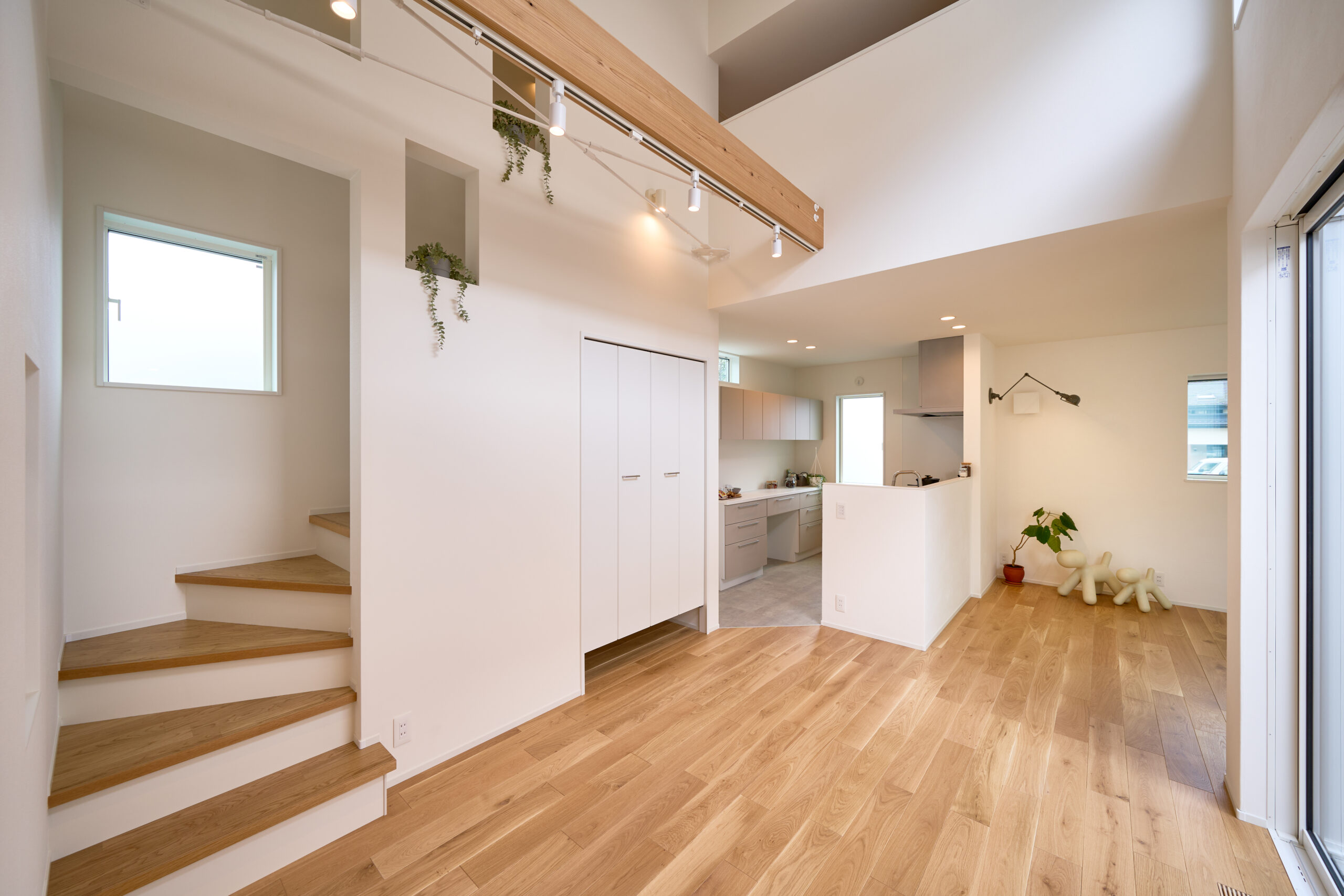 趣味のガレージと家事効率を重視した住まいです。お施主様とともに伐採した木を柱材として用い、地域材の魅力と家づくりの記憶を住まいに刻みました。吹き抜けから差し込むやわらかな光と木の温もりが、心地よい暮らしの空間を生み出しています。