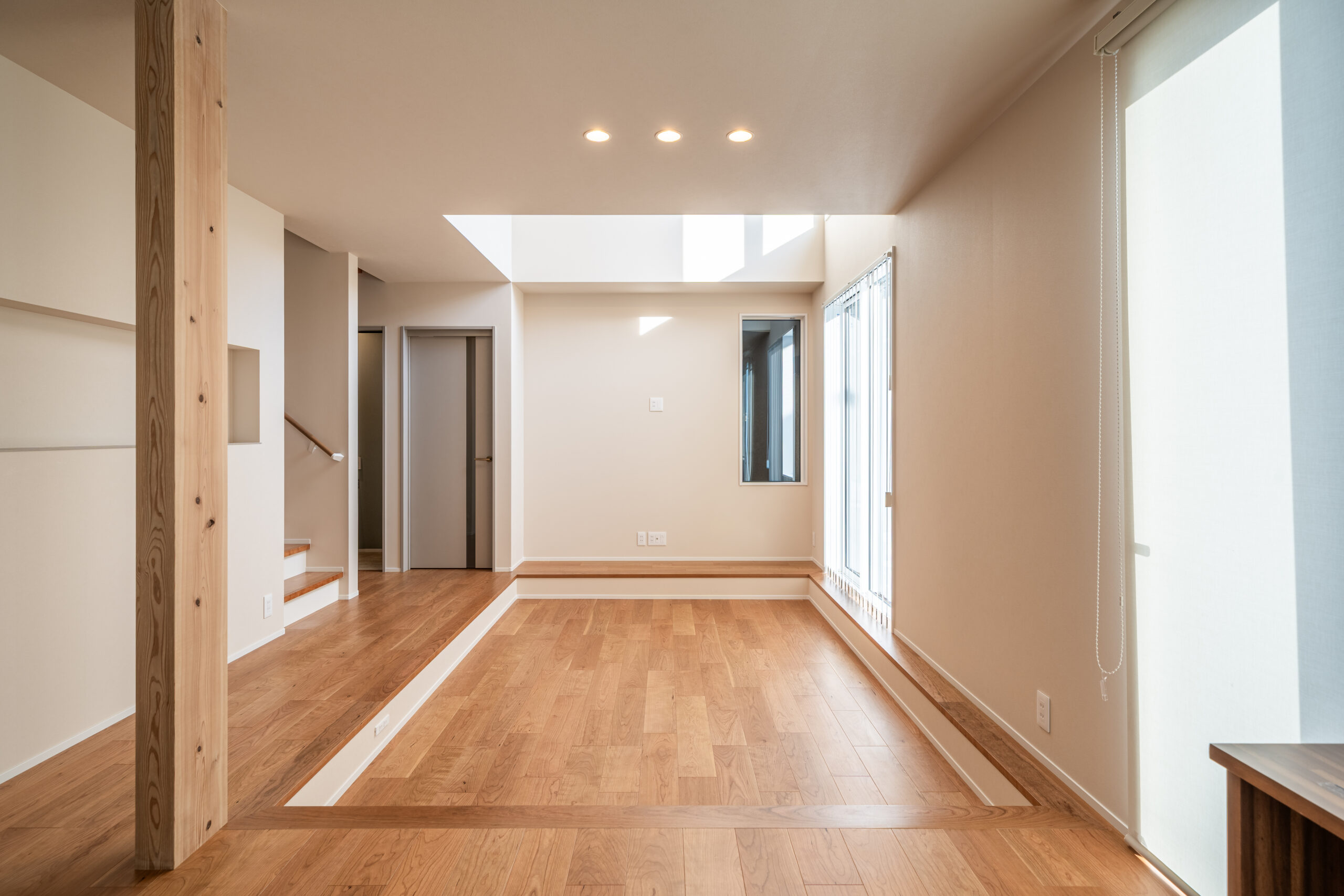 日当たりの課題を解決するため、コの字型の平屋をご提案。中庭と吹き抜けから降り注ぐ光が、住まいの中心まで明るく開放的に照らします。梁にはお施主様とともに伐採した木材を使用し、地域の恵みを活かした開放的な平屋を実現しました。